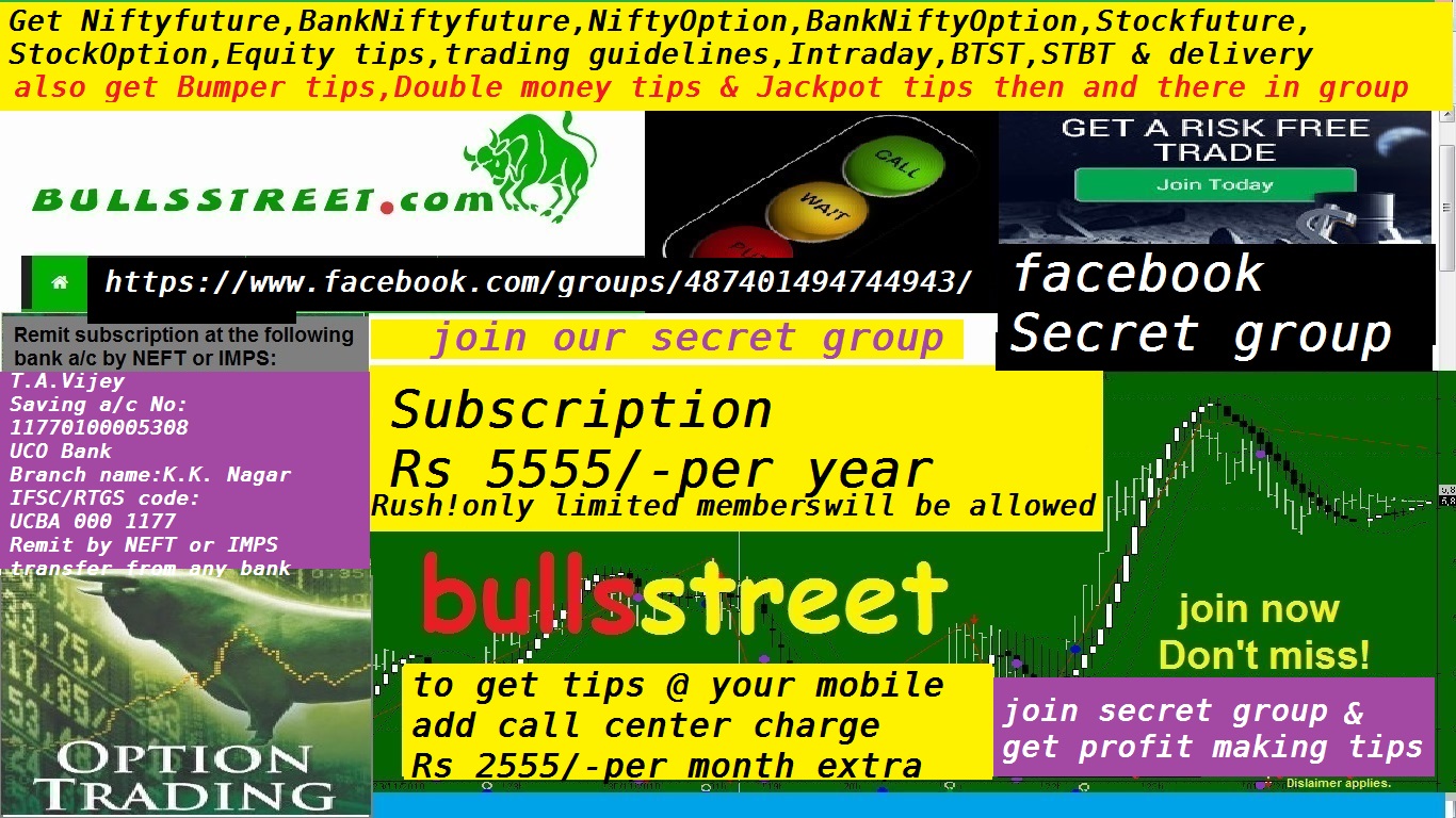 ஆக அமைகிறது.சந்தாத் தொகையை பின்வரும் வங்கிக் கணக்கில் செலுத்தி விட்டு உங்களது பேஸ்புக் ஐடியை தெரிவித்து விட்டு குழுவில் இணைந்து டிரேடிங் குறித்த அனைத்து துரிதத் தகவல்களையூம் பெறலாம்.இந்த குழுவில் நிஃப்டி பாங்க்நிஃப்டி ஸ்டாக் ப்யூச்சர் மற்றும் ஆஃப்ஷன்களுடன்