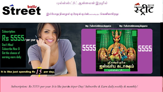 "புல்ஸ்ஸ்ட்ரீட்"-ன் ஆன்லைன் இதழ்களுக்கு நீங்கள் சந்தா செலுத்துவது என்பது இந்த இதழை ஆன்லைனில் நீங்கள் வாசிப்பதற்காக மட்டுமே.இதழுக்கு சந்தா செலுத்தி விட்டு நீங்கள் டிரேடிங் செய்வதும் டிரேடிங் செய்யாமல் இருப்பதும் உங்களது தனிப்பட்ட சொந்த விஷயம்.இதழில் தரப்படும் டிரேடிங் டிப்ஸ்கள் ஒரு கல்வி கற்கும் நோக்கத்துடனும் மார்க்கெட்டில் நடக்கிற விஷயங்களை மார்க்கெட்டில் கிடைக்கிற தகவல்களின் அடிப்படையில் தெரிவிக்கும் நோக்கத்துடன் வழங்கப்படும் விஷயங்கள் மட்டுமே.இதழில் வழங்கப்படும் டிரேடிங் டிப்ஸ்களைப் பயன்படுத்தி உங்களை டிரேடிங் செய்யச் சொல்லவில்லை.நீங்கள் டிரேடிங் செய்தாலும் செய்யாவிட்டாலும் ஒரு முறை சந்தா செலுத்தி விட்டால் அதனை எக்காரணம் முன்னிட்டும் திரும்பப்பெற இயலாது.இது குறித்த கடிதப்போக்குவரத்தோ வாட்ஸ்அப் அல்லது மின்னஞ்சல் வழியான தகவல்போக்குவரத்தோ அல்லது செல்பேசி வழியான தகவல்தொடர்போ வைத்தக் கொள்ள இயலாது என்பதைப் புரிந்து கொள்ளவூம்.எவ்விதமான வாரன்டியூம் கேரன்டியூம் கிடையாது என்பதுடன் உங்களுக்கு ஏற்படும் எவ்விதமான கஷ்டநஷ்டங்களுக்கும் நாங்கள் பொறுப்பேற்க இயலாது.